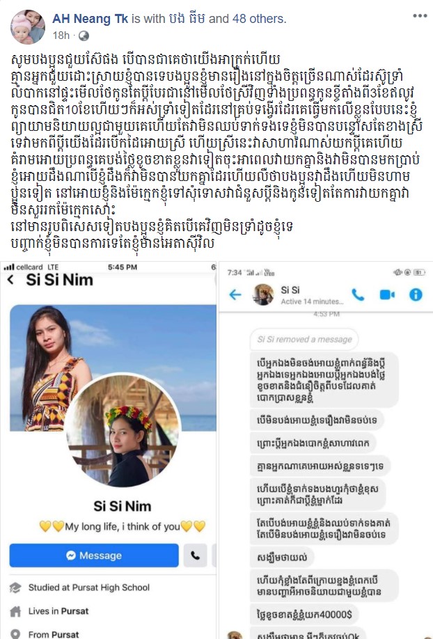 យោងតាមការបង្ហោះរបស់គណនីហ្វេសប៊ុកមួយឈ្មោះ AH Neang Tk កាលពីម្សិលមិញនេះបានសរសេររៀបរាប់ឲ្យដឹងថា៖«សូមបងប្អូនជួយស៊ែផង បើបានជាគេថាយើងអាក្រក់ហើយ គ្មានអ្នកជួយដោះស្រាយខ្ញុំបានទេបងប្អូនខ្ញុំមានរឿងនៅក្នុងចិត្តច្រើនណាស់ដែរស៊ូទ្រាំលំបាកនៅផ្ទះមើលថែកូន តែប្ដីបែរជានៅមើលថែស្រីវិញទាំងប្រពន្ធកូនខ្ចីតាំងពី3ខែ ឥលូវកូនបានជិត10ខែហើយៗ ក៏អស់ទ្រាំទៀតដែរនៅគ្រប់ទង្វើរដែរគេធ្វើមកលើខ្លួនបែបនេះខ្ញុំព្យាយាមនិយាយល្អជាមួយគេហើយតែវាមិនឈប់ទាក់ទងទេខ្ញុំមិនបានបន្ទោសតែខាងស្រីទេវាមកពីប្ដីយើងដែរបើកដៃអោយស្រី ហើយស្រីនេះវាសាហាវណាស់យកប្ដីគេហើយគំរាមអោយប្រពន្ធគេបង់ថ្លៃខូចខាតខ្លួនវាទៀតចុះអាពេលវាយកគ្នានិងវាមិនបានមកប្រាប់ខ្ញុំអោយដឹងណាបើខ្ញុំដឹងក៏វាមិនបានយកគ្នាដែរហើយលឺថាបងប្អូនវាដឹងហើយមិនហាមប្អូនទៀត នៅអោយខ្ញុំនិងម៉ែក្មេកខ្ញុំទៅសុំទោសវាជំនួសប្ដីនិងកូនទៀតតែការវាយកគ្នាវាមិនសួររកម៉ែក្មេកសោះ នៅមានរូបពិសេសទៀតបងប្អូនខ្ញុំគិតបើគេវិញមិនទ្រាំដូចខ្ញុំទេ បញ្ចាក់ខ្ញុំមិនបានការទេតែខ្ញុំមានអេតាស៊ីវិល»។